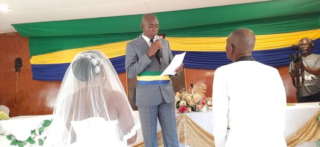 Ce mariage civil fait suite à celui coutumier au quartier Keng-Akaok à Oyem, le jeudi 6 octobre. Au cours de la cérémonie, la fille 𝗡𝗸𝗼𝗱𝗷𝗲𝗻 de la commune et l’ambassadeur du clan 𝗘𝘀𝘀𝗮𝗻𝗱𝗼𝗻𝗲 du village Toulon-Ville se sont échangés des alliances qui font désormais d’eux « 𝘂𝗻 𝗰𝗼𝘂𝗽𝗹𝗲 𝗲𝗺𝗯𝗹é𝗺𝗮𝘁𝗶𝗾𝘂𝗲 ».