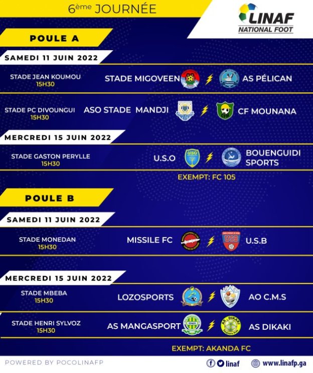 La sixième journée du National-Foot 1 va débuter ce samedi 11 juin 20222 avec trois rencontres dont le derby de la ville de Lambaréné, elle s’achèvera 96 heures après le mercredi 15 juin avec trois autres explications telles que la bataille pour la 3e place en poule B et surtout du déplacement des Koulois à Bitam.